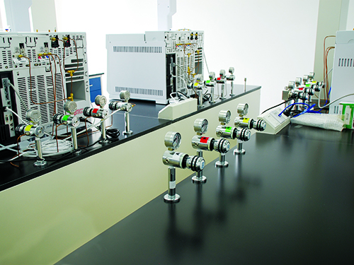 實驗室常用氣體主要有非燃氣體(氮氣、二氧化碳)、惰性氣體(氬氣、氦氣等)、易燃氣體(氫氣、一氧化碳);劇毒氣體(氟氣、氯氣);助燃氣體(氧氣)組成。一般氣相室配置氦氣(He)、氮氣(N2)。氣質聯用配置了氮氣、氫氣、氧氣,氫氣管線上的連接管件都要連接后焊接,嚴禁有泄漏的可能,所有的管線在安裝完畢后一定要做氣密性實驗,并在使用前要先除油,由于管道細小,管間距小,安裝過程中可依據現場情況進行調整,保證間距不小于45mm,氣瓶裝瓶時,易燃易爆與惰性氣體同柜,杜絕兩種易燃氣體鋼瓶裝同一氣瓶柜。